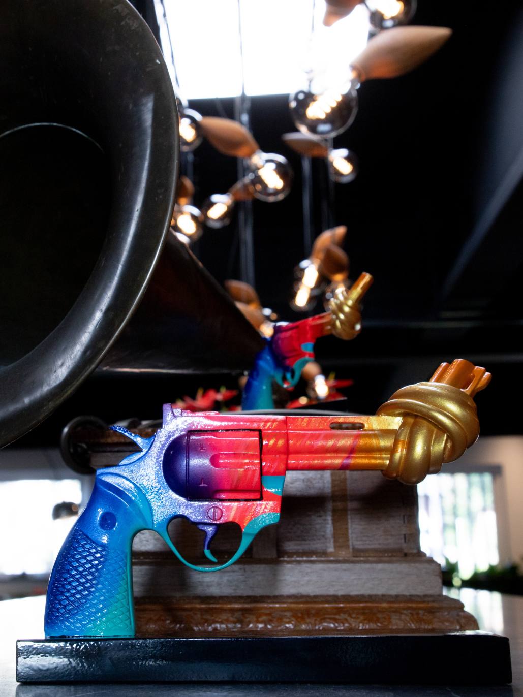 In 2015, conversations began between Tim’s team and the Non-Violence Project about Tim becoming a Peace and Non-Violence Ambassador. As part of this dialogue, a customized version of The Knotted Gun was developed and approved, inspired by the visual identity of his album Stories.