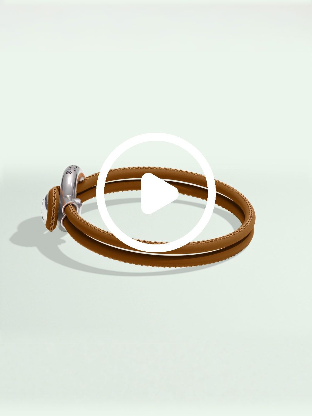 Crafted from 925 sterling silver and brown hand-stitched European leather that gracefully ages over time, its soft, floating ring design evokes freedom and unity.